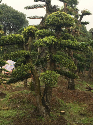造型榆树:选用深山老林采挖的形态各异的老榆树移植至素沙土地,经过数年的精心培育,枝叶茂盛之后方可造型。