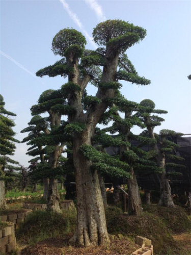 造型榆树:选用深山老林采挖的形态各异的老榆树移植至素沙土地,经过数年的精心培育,枝叶茂盛之后方可造型。